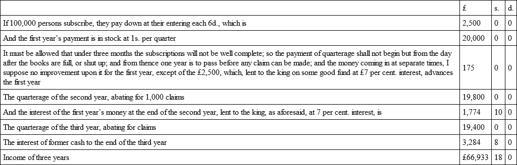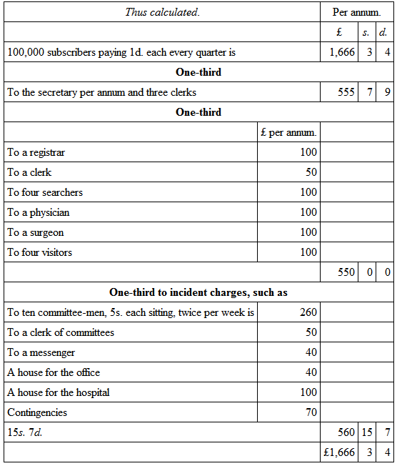 As to my calculations, on which I do not depend either, I say this: if they are probable, and that in five years’ time a subscription of a hundred thousand persons would have £87,537 19s. 6d. in cash, all charges paid, I desire any one but to reflect what will not such a sum do. For instance, were it laid out in the Million Lottery tickets, which are now sold at £6 each, and bring in £1 per annum for fifteen years, every £1,000 so laid out pays back in time £2,500, and that time would be as fast as it would be wanted, and therefore be as good as money; or if laid out in improving rents, as ground-rents with buildings to devolve in time, there is no question but a revenue would be raised in time to maintain one-third part of the number of subscribers, if they should come to claim charity.