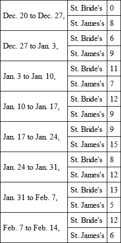 The like increase of the bills was observed in the parishes of St. Bride's, adjoining on one side of Holborn Parish, and in the parish of St. James's, Clerkenwell, adjoining on the other side of Holborn; in both which parishes the usual numbers that died weekly were from four to six or eight, whereas at that time they were increased as follows: —