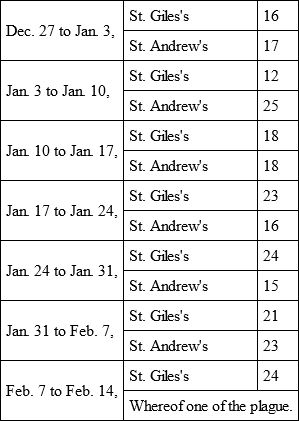 This increase of the bills stood thus: the usual number of burials in a week, in the parishes of St. Giles-in-the-Fields and St. Andrew's, Holborn,11 were12 from twelve to seventeen or nineteen each, few more or less; but, from the time that the plague first began in St. Giles's Parish, it was observed that the ordinary burials increased in number considerably. For example: —
