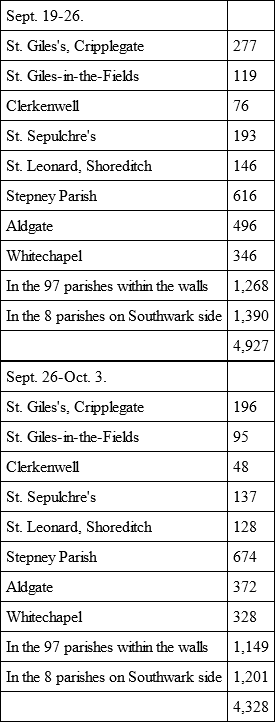 And now the misery of the city, and of the said east and south parts, was complete indeed; for, as you see, the weight of the distemper lay upon those parts, that is to say, the city, the eight parishes over the river, with the parishes of Aldgate, Whitechapel, and Stepney, and this was the time that the bills came up to such a monstrous height as that I mentioned before, and that eight or nine, and, as I believe, ten or twelve thousand a week died; for it is my settled opinion that they254 never could come at any just account of the numbers, for the reasons which I have given already.