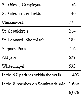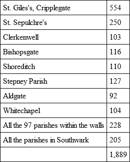Even when the north and northwest suburbs were fully infected, viz., Cripplegate, Clerkenwell, Bishopsgate, and Shoreditch, yet still all the rest were tolerably well. For example: —