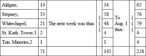 I need not say that these orders extended only to such places as were within the lord mayor's jurisdiction: so it is requisite to observe that the justices of peace within those parishes and places as were called the "hamlets" and "outparts" took the same method. As I remember, the orders for shutting up of houses did not take place so soon on our side, because, as I said before, the plague did not reach to this eastern part of the town at least, nor begin to be violent till the beginning of August. For example, the whole bill from the 11th to the 18th of July was 1,761, yet there died but 71 of the plague in all those parishes we call the Tower Hamlets; and they were as follows: —