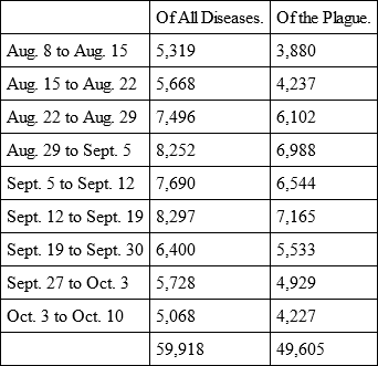 So that the gross of the people were carried off in these two months; for, as the whole number which was brought in to die of the plague was but 68,590, here is149 50,000 of them, within a trifle, in two months: I say 50,000, because as there wants 395 in the number above, so there wants two days of two months in the account of time.150