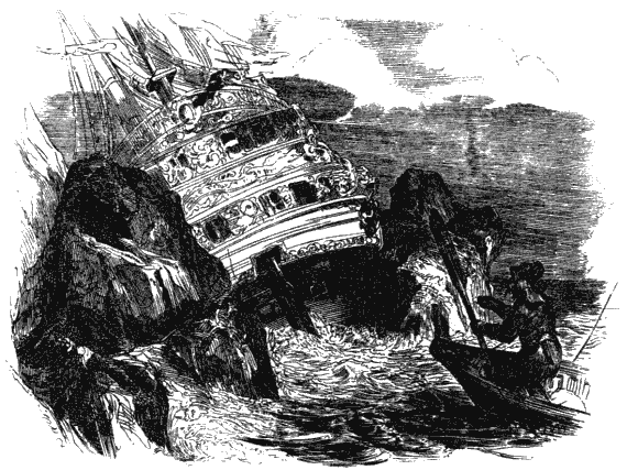 Весь день я наблюдал за видневшимся в море предметом и вскоре убедился, что он неподвижен. Я заключил отсюда, что это стоящий на якоре корабль. Легко представить, как не терпелось мне удостовериться в правильности моей догадки; я схватил ружье и побежал на юго-восточный берег, к скалам, где я когда-то был унесен течением. Погода между тем совершенно прояснилась, и, придя на место, я, к великому моему огорчению, отчетливо увидел кузов корабля, наскочившего ночью на подводные рифы, замеченные мною во время путешествия в лодке; эти рифы преграждали путь морскому течению и продолжали как бы встречное течение, и потому им я обязан избавлением от самой страшной опасности, какой я когда-либо подвергался за всю свою жизнь.
