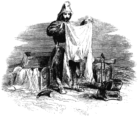 Я провел ночь в лодке, а утром решил перенести свою добычу в новый грот, чтобы не тащить ее к себе в крепость. Подкрепившись едой, я выгрузил на берег привезенные вещи и произвел подробный осмотр их. В бочонке оказался ром, но, говоря откровенно, весьма неважный, совсем не такой, как тот, что был у нас в Бразилии; зато в сундуках я нашел несколько полезных вещей, например, изящной работы погребец, уставленный бутылками какой-то особенной формы, с серебряными пробками (в каждой бутылке было до трех пинт очень хорошей настойки); затем две банки очень вкусных цукатов, или засахаренных фруктов, так плотно закупоренных, что в них не попало ни капли морской воды, и еще две банки, содержимое которых подмокло. В том же сундуке лежало несколько штук очень хороших рубах, которые были для меня очень приятной находкой; затем около полутора дюжин белых полотняных носовых платков и столько же цветных шейных; первым я очень обрадовался, представив себе, как будет приятно в жаркие дни утирать вспотевшее лицо тонким полотном. На дне сундука я нашел три больших мешка с деньгами; всего в трех мешках было тысяча сто серебряных «восьмериков», а в одном оказалось еще шесть золотых дублонов, завернутых в бумагу, и несколько небольших слитков золота общим весом, я думаю, около фунта.
