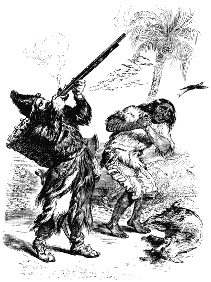 Мне скоро удалось его убедить, что я не имею ни малейшего намерения причинить ему вред. Я взял его за руку, засмеялся и, указав на убитого козленка, велел сбегать за ним, что он и исполнил. Покуда он возился с козленком и выражал свое недоумение по поводу того, каким способом тот убит, я снова зарядил ружье. Немного погодя я увидел на дереве, на расстоянии ружейного выстрела от меня, большую птицу, которую я принял за ястреба. Желая дать Пятнице маленький наглядный урок, я подозвал его к себе, показал ему пальцем сперва на птицу, которая оказалась не ястребом, но попугаем, потом на ружье, потом на землю под тем деревом, на котором сидела птица, приглашая его смотреть, как она упадет. Вслед за тем я выстрелил, и он действительно увидел, что попугай упал. Пятница и на этот раз перепугался, несмотря на все мои объяснения; он был ошеломлен еще и потому, что он не видел, как я зарядил ружье, и, вероятно, думал, что в этом оружии сидит какая-то волшебная разрушительная сила, приносящая смерть на любом расстоянии человеку, зверю, птице, словом, всякому живому существу. Еще долгое время он не мог совладать с изумлением, в которое его поверг мой выстрел. Мне кажется, что, если бы я ему только позволил, он стал бы воздавать божеские почести мне и моему ружью. Первое время он не решался дотронуться до ружья, но зато разговаривал с ним, как с живым существом, когда находился подле него. Он признался мне потом, что просил ружье не убивать его.