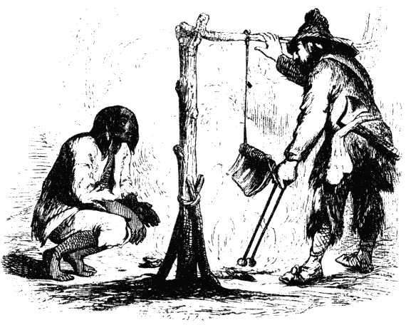 Когда Пятница немного опомнился от испуга, я приказал ему принести мне убитую птицу. Он сейчас же пошел, но замешкался, отыскивая ее, потому что, как оказалось, я не убил попугая, а только ранил, и он отлетел довольно далеко от того места, где я его подстрелил. В конце концов Пятница все-таки нашел его и принес; так как я видел, что Пятница все еще не понял действия ружья, то воспользовался его отсутствием, чтобы снова зарядить ружье, в расчете, что нам попадется еще какая-нибудь дичь, но больше ничего не попадалось. Я принес козленка домой и в тот же вечер снял с него шкуру и выпотрошил его; потом, отрезав хороший кусок свежей козлятины, сварил ее в глиняном горшке, и у меня вышел отличный бульон. Я начал есть сам, затем угостил Пятницу. Ему понравилась еда, только он удивился, зачем я ем суп и мясо с солью. Он стал показывать мне знаками, что с солью невкусно. Взяв в рот щепотку соли, он принялся отплевываться и сделал вид, что его тошнит от нее, а потом выполоскал рот водой. Тогда я, в свою очередь, положил в рот кусочек мяса без соли и начал плевать, показывая, что мне противно есть без соли. Но это не произвело на Пятницу никакого впечатления; я так и не мог приучить его солить мясо или суп. Лишь долгое время спустя он начал класть соль в кушанье, да и то немного.