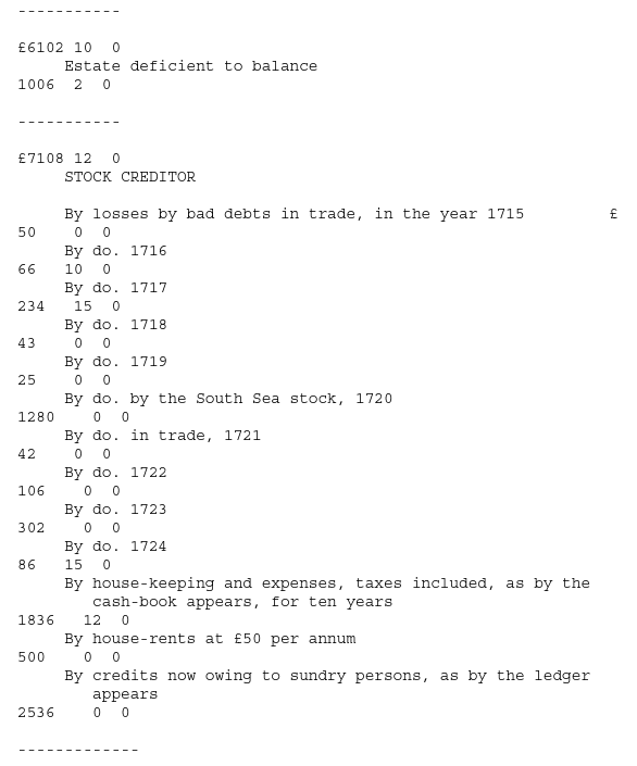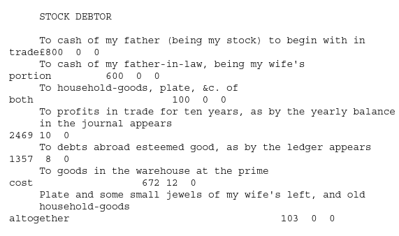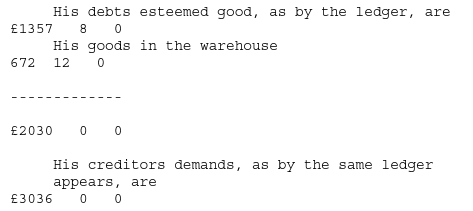 When he looks into his books, he finds himself declined, his own fortune lost, and his creditors' stock in his hands wasted in part, and still wasting, his trade being for want of stock much fallen off, and his family expense and house-rent great; so he draws up the general articles thus: —