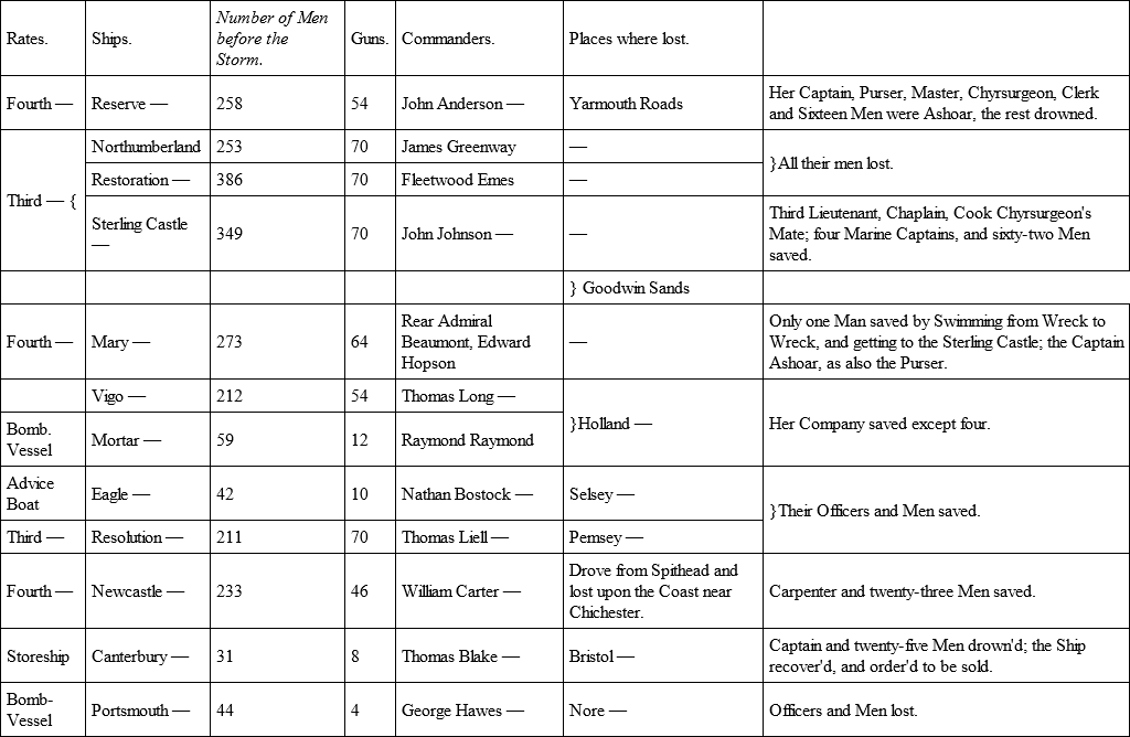 The loss immediately sustain'd in the Royal Navy during the Storm, is included in the List hereunto annex'd, as appears from the Navy Books.