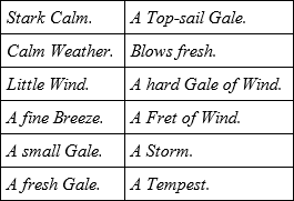 From hence it comes to pass, that such Winds as in those Days wou'd have pass'd for Storms, are called only a Fresh-gale, or Blowing hard. If it blows enough to fright a South Country Sailor, we laugh at it: and if our Sailors bald Terms were set down in a Table of Degrees, it will explain what we mean.