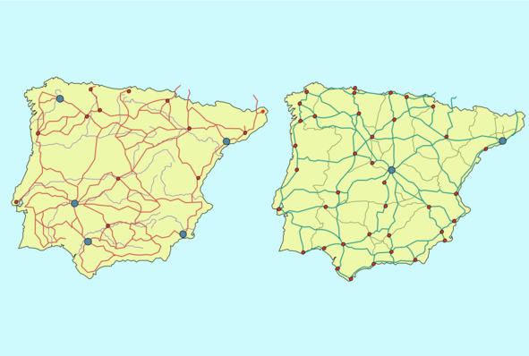 И раз уж речь зашла о фундаментальности, взгляните на карту римских дорог в Испании. А потом сравните ее с картой современных. Специально не буду пояснять, что и на какой картинке изображено, – прекрасно видно, что огромная часть маршрутов используется и по сей день.