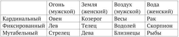 Следующая таблица иллюстрирует разделение знаков Зодиака по «стихиям» и «троичностям качеств».