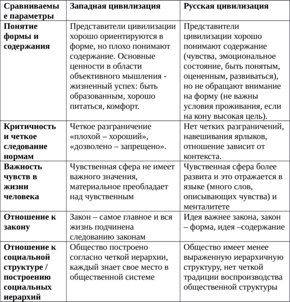 В завершении описания ментальных различий представителей западной и русской цивилизации, можно привести тот факт, что, например, в западной традиции выделяют 2 вида животных: хищники (охотятся, едят мясо) и травоядные (едят растительную пищу). В русской традиции хищники добывают пищу посредством хищения, а лютые – посредством гона. То есть важен способ добычи пропитания, а не сам факт поедания той или иной пищи.