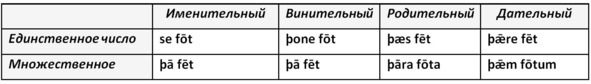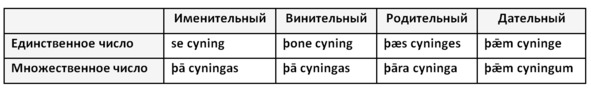 cyning – king (король) – существительное мужского рода в сопровождении определителя (determiner), в современном языке the, демонстрирует общую тенденцию, которая в результате дошла до современного английского языка – использовать окончание -s для образования множественного числа.