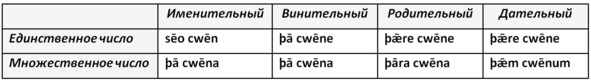 cwēn – queen (королева) – существительное женского рода в сопровождении определителя (determiner).