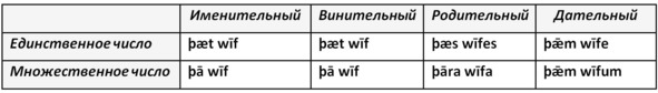 wīf – woman (женщина) – существительное среднего рода в сопровождении определителя (determiner).
