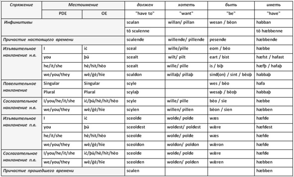 Надо сказать, что в древнеанглийском не выделялось никаких вспомогательных глаголов, все глаголы имели только своё собственное значение. Глагол sculan (PDE – shell) имел значение «должен», willan (PDE – will) – «хотеть, собираться, выражать волю», wesan/bēon (PDE — be) – «находиться, иметься, быть», habban (PDE – have) – «владеть, иметь во владении». Со временем, при движении от синтетического Old English к аналитическому Present Day English, эти и другие глаголы приобрели дополнительные функции вспомогательности, но свои первоначальные значения не утратили. В этом можно убедиться, заглянув в любой словарь. Например, одно из значений глагола will – «завещать», то есть выразить свою волю относительно чего-то.