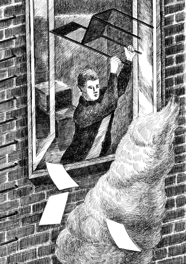 Он прополз к столу, где громоздились отобранные материалы. Стащил их на пол и, щуря слезящиеся глаза, плотно связал между собой все бумаги и папки. Затем, разбив настольной лампой выходящее на улицу окно, вышвырнул бумажную пачку наружу. Немного подумал и послал вслед лампу, а потом добавил пишущую машинку. Из дыма появился полицейский: