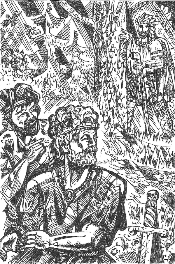 Два плечистых бородатых человека, одетые в одинаковые кожаные рубахи, увешанные оружием и походным скарбом, вышли на поляну и остановились. За их спинами горбатились громадные мешки из грубой рогожи, напряжённые лица были мокры от пота, а длинные волосы, схваченные на лбу вышитыми ремешками, слиплись и перепутались с чащобным сором.