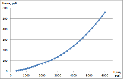 Из графика видно, что зависимость была не линейная, налоговое бремя росло непропорционально быстро вместе с ростом цены арендной платы. Так, за квартиру стоимостью от 300 до 360 рублей в 1912 году платился налог в 5 рублей серебром, за квартиру стоимостью 2200–2400 рублей – платили 94 рубля, а за квартиру доход с которой превышал 6000 рублей – налог рассчитывался в 10 % от наемной платы[154]. Под наемной платой, от которой рассчитывался налог, понималась не только плата за наем собственно квартиры и других помещений, но и плата за услуги дворника, швейцара, отопление, снабжение квартиры дровами, мебелью и т. д.
