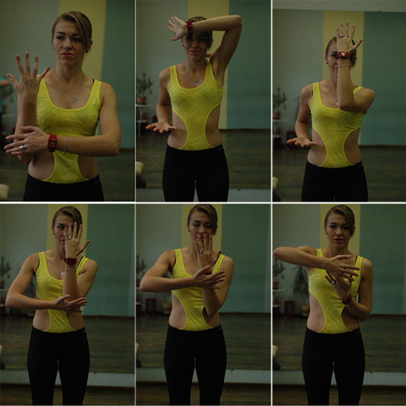 – И. П. Особенность: что рука в кистевом сгибе упирается в локтевой сгиб другой руки. В этом упражнении важно отследить, что центром вращения являются локтевые суставы! Движение начинается с вращения кистевого сустава, вниз вовнутрь (рис.15). Далее рука начинает скользить по другой и происходит смена рук (рис.16—20). Внимание стоит уделить тому, что руки ВСЕГДА под 90 градусов. И теперь другая рука упирается кистевым сгибом в локтевой сустав. и т. д.