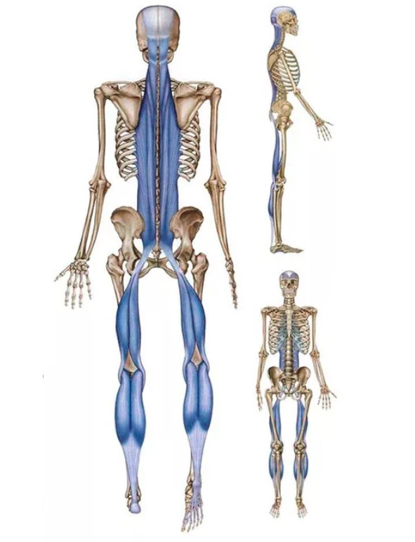 Ход поверхностной задней линии: подошвенная фасция и короткие сгибатели пальцев ног; подошвенная поверхность фаланг пальцев ног; пяточный бугор; ахиллово сухожилие/икроножная мышца; мыщелки бедренной кости; подколенные мышцы; крестцово-бугорная связка; седалищный бугор; крестцово-поясничная фасция; крестец; поясничная часть мышцы, выпрямляющей позвоночник; сухожильный шлем; затылочный бугор; надбровные дуги.