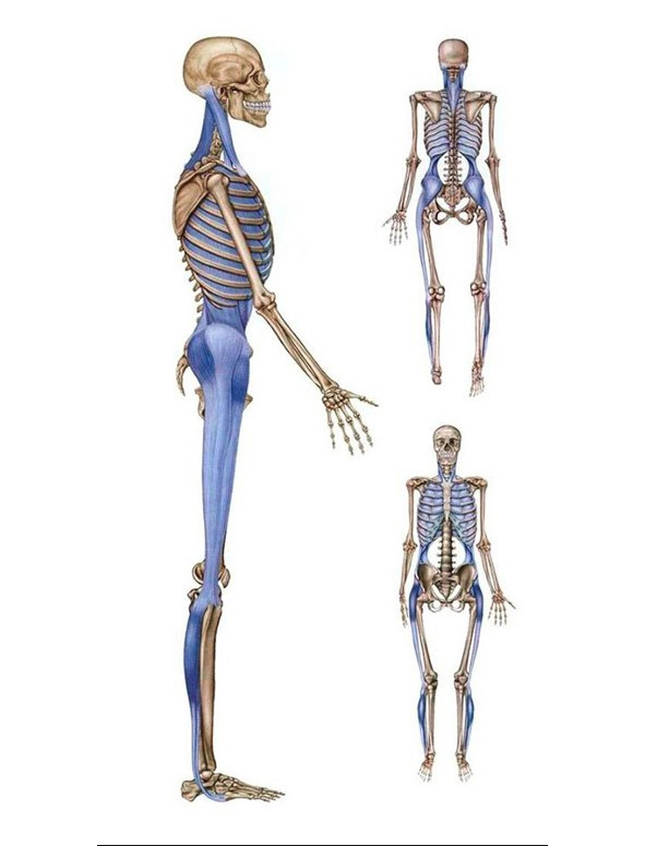 Для более образного восприятия, представьте, что каждая отдельная мышца тела завернута в «пакетик» под названием фасция, а группы мышцы запакованы в более крупные пакеты. А теперь представьте длинный продольный рукав с множеством карманов, в которых закреплены мышцы. Этот пакет прикрепляется к скелету человека (например, к пятке или к костям пальцев). Эти длинные фасциально-мышечные пакеты, которые повторяют векторы движения, Томас Майерс назвал анатомическими поездами. На пути поездов могут возникать препятствия, прерывающие связи. Они бывают в виде блоков, спаек или зажимов и влияют на движение по всей линии. Именно по этой причине боль в шее часто связана с плоскостопием или нерастянутыми подколенными сухожилиями. Эффективная коррекция мышечных блоков и нарушений осанки, сегодня немыслимы без знания линий этих поездов.