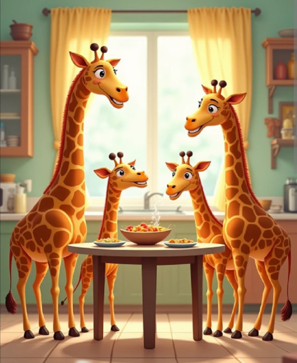 Дверь медвежонку открыла мама Яши. Молча выслушав Реджи, она впустила его в дом. В тот вечер семья жирафчика дружно ужинала на кухне. Малыша тоже пригласили к столу. Но вот незадача: стульев на кухне не оказалось. Потому что жирафы едят стоя. А ещё в доме Яши не было ни одной кровати. Потому что спят жирафы тоже стоя. Медвежонок понял, что о привычном домашнем комфорте ему оставалось только мечтать. Утром малыш поблагодарил родителей Яши за гостеприимство и отправился на поиски другого подходящего дома.
