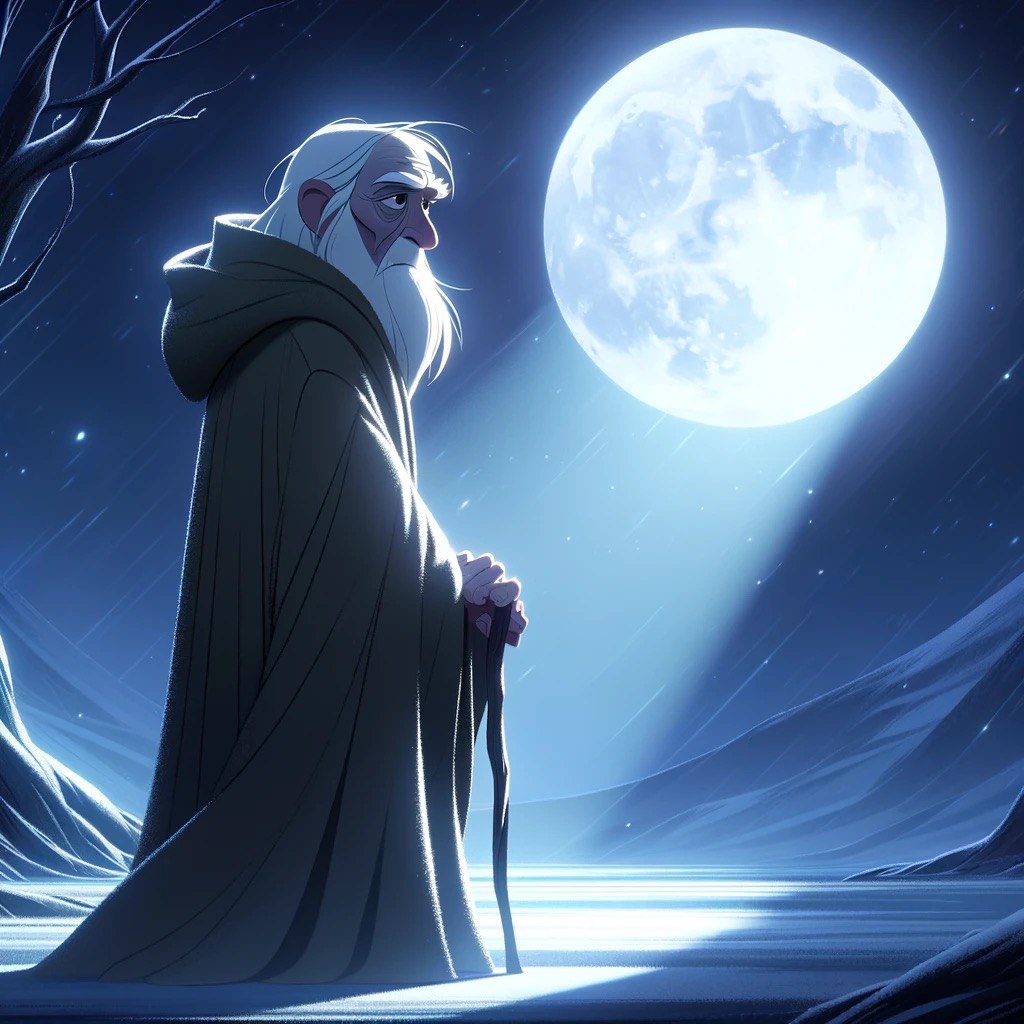 Старик, облаченный в плащ, стоял перед ними как воплощение вечности, его глаза, отражавшие свет луны, внимательно изучали Эшли и Боба. "Добрый вечер, странники," – его голос, едва слышный, словно шепот, разрезал ночную тишину, наполнив ее теплом и спокойствием. "Темнеет, а вы, похоже, заблудились среди этих троп. Куда направляетесь в столь поздний час?"