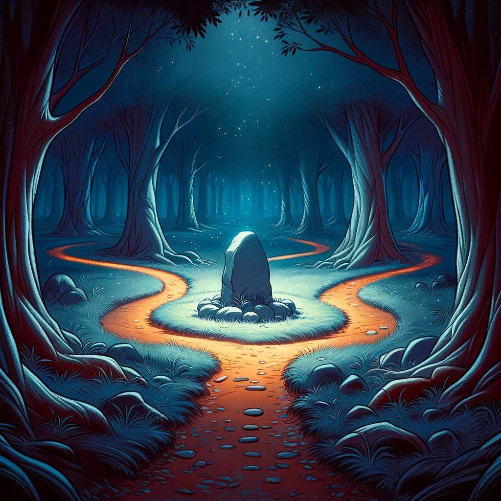 За разговорами ребята вышли на небольшую поляну, где тишина ночного леса лишь иногда нарушалась шелестом листьев. В центре поляны стоял древний камень, на котором были изображены три дороги, ведущие в неизведанные глубины леса. Каждая дорога предлагала свой путь, свои испытания и свои обещания, а выбор пути теперь лежал на плечах ребят. Эшли и Боб столкнулись с выбором, который мог определить всё их дальнейшее путешествие. Описание на камне было словно приглашение к размышлению о судьбе и выборе.