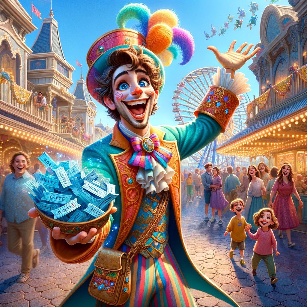 Эшли и Боб, ведя между собой беседу и аккуратно перебирая в руках свежеполученные зеленые билетики от Хриплого, направились к колесу обозрения. В то время как они продвигались по направлению к аттракциону, их внимание было привлечено к необычайно яркому персонажу, появившемуся на улице. Этот уличный артист, являвшийся воплощением экстравагантности Острова Развлечений, с энтузиазмом размахивал своими билетами и громко объявлял: "Обменяйте один зеленый билетик на целых 100 синих! Эксклюзивное предложение, доступное только сегодня и только для вас!"