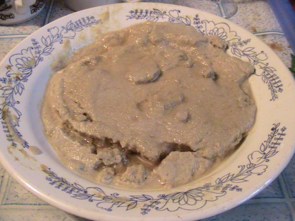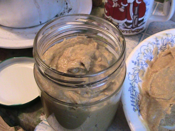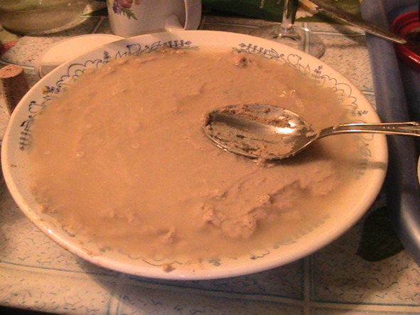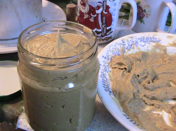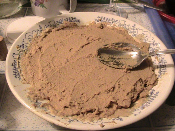 «В тарелке насыпано 8 столовых ложек с горкой (как получится!) – горчичного порошка. Чуть, понемножку, наливаем маленькое количество воды в середину тарелки: ТЩАТЕЛЬНО ПЕРЕМЕШИВАЯ чайной ложкой, помогая столовой. Соскребая прилипающий намокший горчичный порошок чайной ложкой -со столовой ложки. Потом столовой – соскребать с чайной: такая вот «взаимовыручка»! Размешиваем, доливаем: ДО СОСТОЯНИЯ «ГУСТОГО ТЕСТА»!