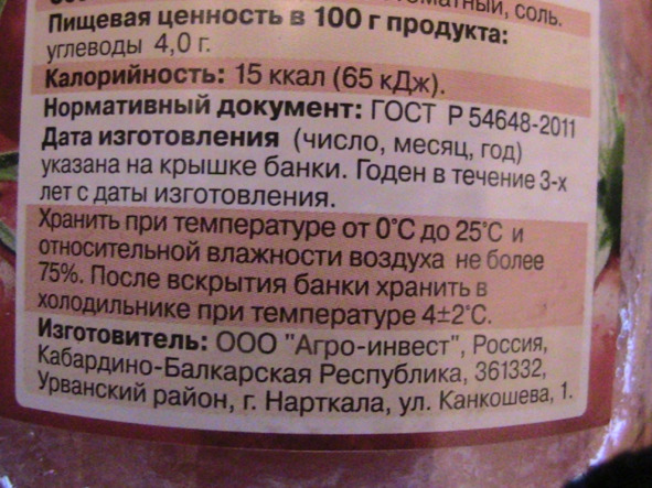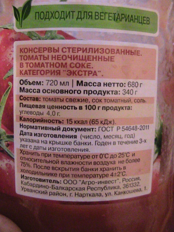 «„Мой выбор – 2019 „№1““: „ТОМАТЫ в собственном соку"изготовитель: ООО „Агро-инвест“, Россия, Кабардино-Балкарская Республика, Урванский район, г. Нарткала, ул. Канкошнева,1. „ТОМАТЫ в собственном соку“ ПОМИДОРКА“», которые были куплены в «ГИПЕРМАРКЕТЕ – Магнит», и которые произвели на меня ПОТРЯСАЮЩИЙ ЭФФЕКТ: вкусные и… ЗАЛИТЫЕ СОКОМ ИМЕННО ИЗ ПОМИДОР– это ЯСНО и ВИДНО по консистенции сока-заливки в банке!