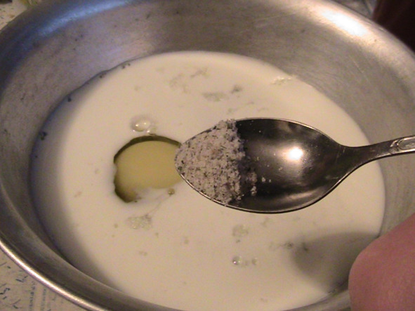 Яичница погуще: 3/4 стакана (250-ти стеклянного, гранёного стакана) молока 2,5%. жирности. Если захотелось яичницы пожиже: наливай 1 стакан;0,5 чайной ложки «Адыгейской» или обычной мелкой соли.