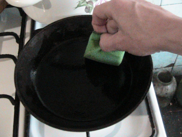 И только ЕСЛИ ГУБКА СОВСЕМ СУХАЯ, без масла, которое остаётся в ней, то только тогда на сковороду капни чуть-чуть ГОРЧИЧНОГО масла немного и после этого промажь губкой. И теперь, смазав всю поверхность -СПЕЦИАЛЬНО для этого губкой, будем жарить. Губка – как для посуды: но лежит в закрытой баночке в холодильнике- рядом с горчичным маслом. В эту же баночку-«отжать» излишки масла со сковороды, плотно закрыть баночку с губкой крышечкой и убрать в холодильник – поближе к горчичному маслу!