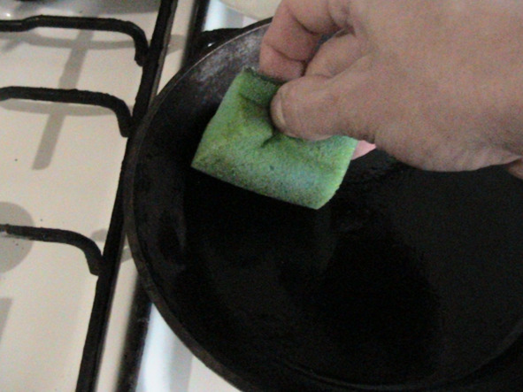 Но если невмоготу, и очень хочется жареных яиц или омлета, тогда жарим на горчичном. Желательно взять старую и проверенную временем и качеством СССР ЧУГУННУЮ СКОВОРОДКУ: в ней -яйца точно не пригорят. И в ней-не будет современных вредностей современного антипригарного покрытия поверхности сковороды. И так, продолжим! Поверхность сковороды необходимо немного смазать маслом: чтобы омлет не пригорел. Для этого ПРОВЕДЁШЬ СПЕЦИАЛЬНО приспособленной у тебя для этого – промасленной полимерной губкой «для посуды» ПО ВСЕЙ ПОВЕРХНОСТИ и КРАЯМ сковороды-обильно промазав!