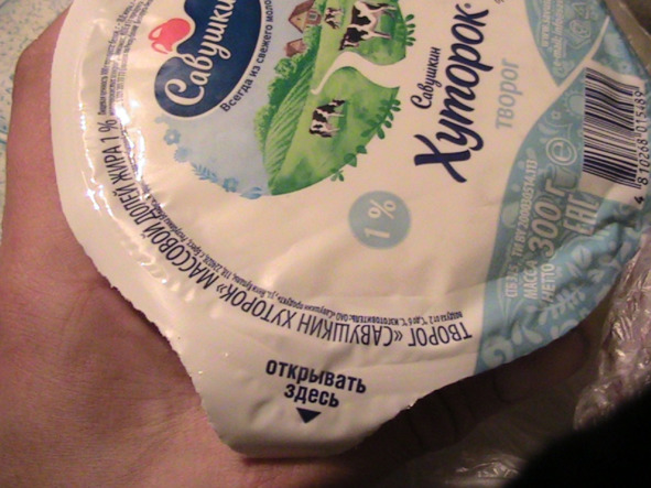 Сейчас МАРТ 2019 года: эта упаковка творога, которая в «Магните» продаётся по 129 рублей за 500 грамм (!!!), мне, военному пенсионеру, получающему на руки 8 тысяч 900 рублей – этот творог стал… НЕ ПО КАРМАНУ Слава Богу, в «Магните» с конца декабря 2018 года, и по сей день ОЧЕНЬ часто стали акции:" 2 по цене 1», уценки товаров.. Вот на такоих «УЦЕНКАХ» и акциях иногда везёт: то яйца подешевле накуплю побольше (уж их то-НЕ «подпортят»! ),то сгёшёнку. И вот на одной из такой распродажи по КРАСНЫМ ЦЕННИКАМ, увидел «Савушкин ХУТОРОК», творог -1% жирности производства г. Брест республики Беларусь! Там, в Белоруссии, у них ВСЕ ПРОДУКТЫ-НАСТОЯЩИЕ! Слава Богу, что до нас – они ещё каким то образом ДОХОДЯТ: настоящие и качественные «ПРОДУКТЫ ЗДОРОВЬЯ»!!! Сгущённое молоко я покупаю именно БЕЛОРУССКУЮ.. И..ВСПОМНИЛ: я же его как-то брал: КЛАССНЫЙ, НАСТОЯЩИЙ, ВКУСНЫЙ ТВОРОГ! И пачка: 300 -граммовая, как раз то, ЧТО НАДО, чтобы СЪЕСТЬ ЗА РАЗ!!! Ни много, ни мало! Та то:500-граммовая! На два делить..И трудновато остановиться бывает на половине пачки: ведь легко и вкусно же! И упаковка УДОБНАЯ: оторвал сверху за язычок верхушку упаковки, и ешь творог!