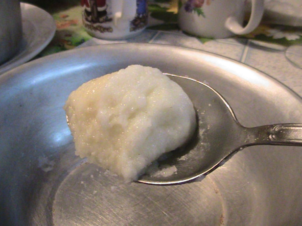 «Рецепт „МГНОВЕННОЙ“ манной каши. Влить 1,5 стакана молока 2,5% жирности. Затем влить 1 стакан холодной сырой воды. ставим на огонь. Всыпать 1 чайную ложку с горкой крупной соли. всыпать ещё 3 чайной ложки сахара…»