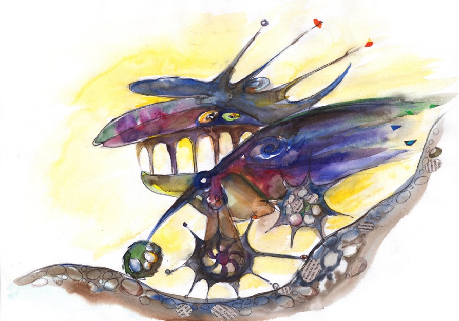 И вот уже ОНИ смотрят на Город. Дома в Городе растут прямо из стены, по которой ползут зелёные растения. Город раскинулся на заливном лугу, и множество высоких деревьев, с сомкнутыми наверху ветвями, окружают его. Ветер чуть шевелит их верхушки и подгоняет облака. Слышно, как шумит ветер в кронах деревьев и поют птицы. Но вот на небе, над Городом, появляется маленькое пятнышко, оно постепенно приближается и вскоре превращается в тёмно-сизую тучу, которая опускается на Город. Поначалу сквозь неё еще пробиваются лучи одного из Солнц, второе Солнце светит за спиной у друзей – это очень красиво! Потом темнота становится мощнее, съедает всё и опускается на Город. Но это не дождь и не ураган. Тишина, ни ветерка, ни звука кругом. На глазах у друзей трава сразу же тускнеет и пропадает, как будто её и не было, вьющиеся растения затягиваются внутрь стены, как змеи, деревья вырываются с корнем и исчезают в образовавшихся проломах земли. И вот перед путешественниками пустыня: голая, твёрдая как камень, с трещинами земля – ни одного растения, пустые стены и дома на них – скелет Города…Внезапно стены бледнеют и становятся прозрачными. Друзья видят в самом сердце Города сизое туманное пятно. Видно, что у него шевелящиеся конечности и множество глаз. А еще сверху на этом чудовище огромная черная дыра, которая затягивает в себя всё живое, именно туда летят деревья, трава, иногда птицы и мелкие животные. И исчезают в недрах прожорливой дыры.