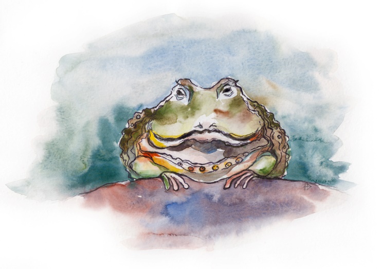 Друзья послушно подошли к кустарнику. Там, у берега маленького прудика, наполовину в воде сидела давняя знакомая Веснушки и Веточки – та самая жаба, которую девочки недавно поймали и отпустили. Но только она стала намного больше, размером с хорошего телёнка.