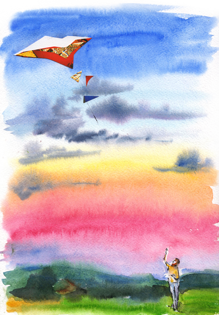 Невысокий огнебородый человек, похожий на мальчишку, управлял желто-красным воздушным змеем. Дёргая за верёвку, перебегая с места на место, человек этот, казалось, управлял не только змеем, но и облаками, и солнцем, держащимися в небе благодаря его, человека, огненной силе.