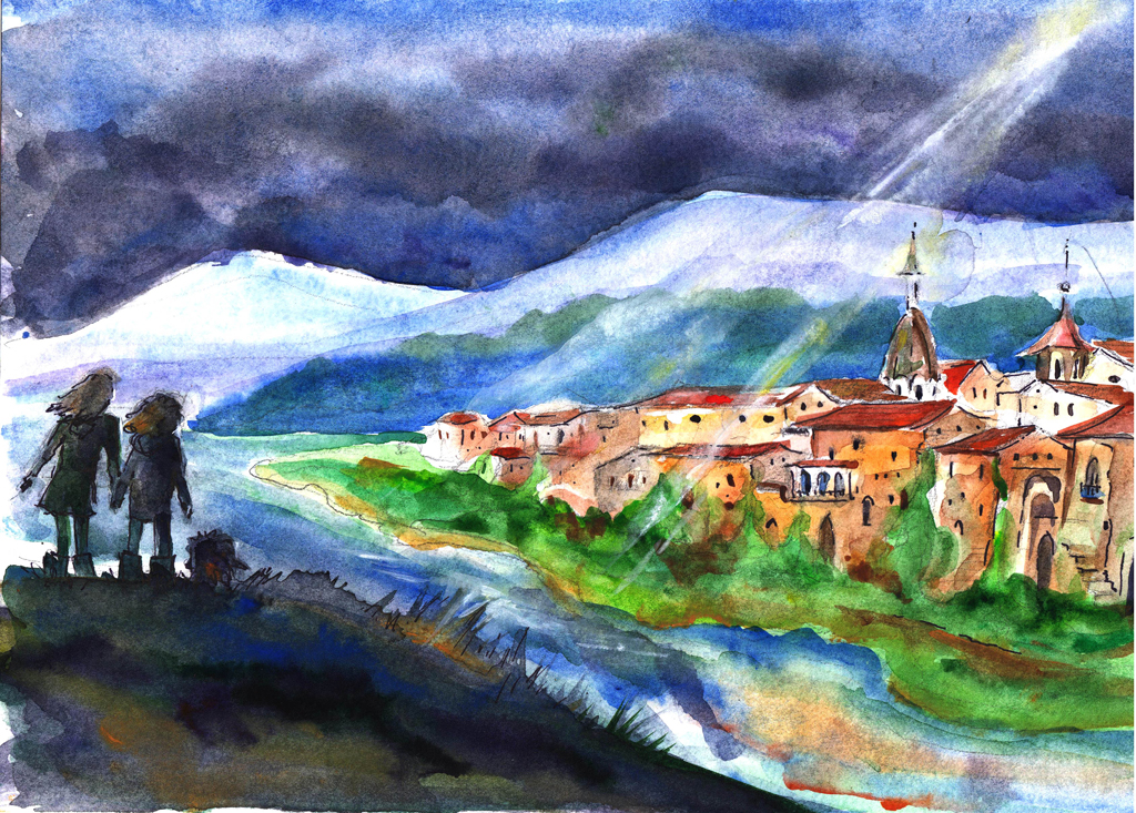 Над обрывом, на берегу, стоят две девочки. Рядом с ними – маленькое существо. Они смотрят на дивный Город.