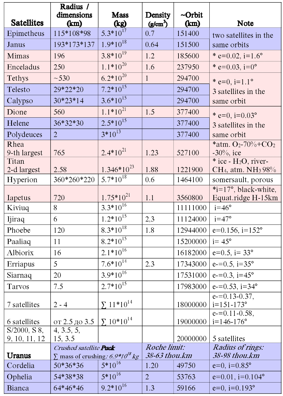 Uranus has rings closest to the planet, located at the distance 38-98 thousand km. This can be explained by the fact, that before destruction Uranus was less, than the other three planets. Consequently, Roche limit is nearest to him. It has 11 fragments of the destroyed satellite, more than the other three gas giants. The destroyed object can be called Puck , by the name of the largest fragment. The total mass of the fragments is ~6.9*1018 kg, the second after Neptune. The rings of Uranus are insignificant in comparison with Saturn. This means, that the explosion was not strong. Probably, Puck was very old, and a little magma there was inside, and the crust was very thick. The more powerful explosion gives more small particles (rings). Presumably, numerous fragments have gathered particles from rings, or they were scattered. From all other SS planets Uranus is distinguished by the fact, that it "turned on its side" with its entire system of satellites.