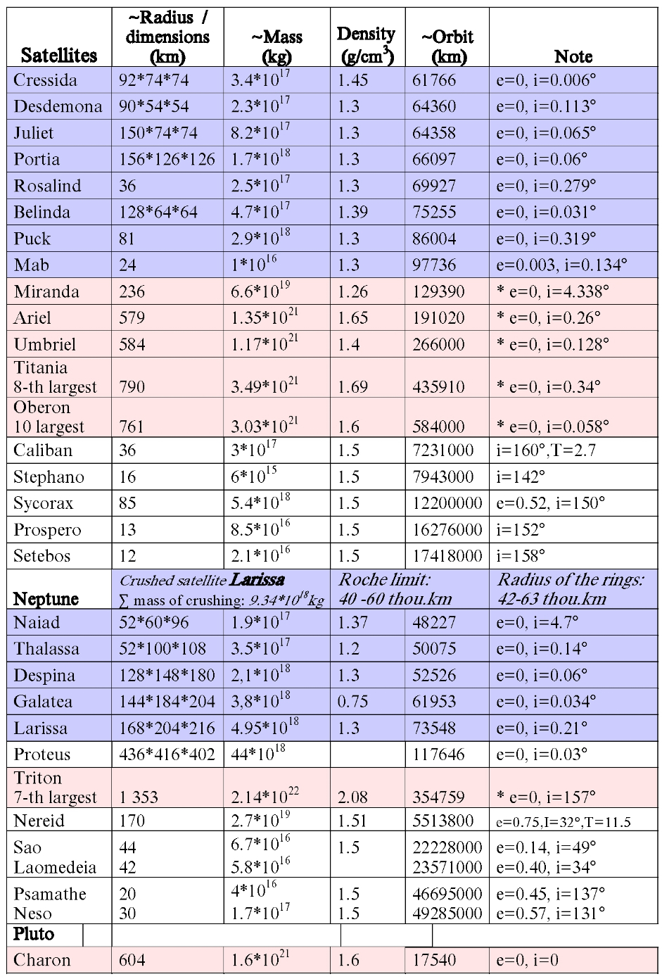 Neptune has a faint system of rings 42-63 thousand km. It has 5 fragments of the destroyed satellite, with total mass ~9.3*1018kg. It is a largest mass from the all crushed satellites. It can be called Larissa, by the name of the largest fragment. Despite the largest mass of fragments, Neptune has minimum destruction among four gas planets?! It has the highest density and the slowest rotation – 16 hours/day, other gas planets – 10 hours/day. To explain this, we can assume, that the destroyed satellite was not moon (not of planetary type), or its crust was thick and internal magma was little, and the explosion was weak. The mission "Voyager 2" studied satellites of Neptune in 1989. Proteus – a large non-spherical satellite has an equatorial ridge, possibly, assembled from rings. Judging by Proteus, the rings were more wide and reached its orbit. Neptune has only 1 moon – Triton. It is the most remote satellite having eruptions.