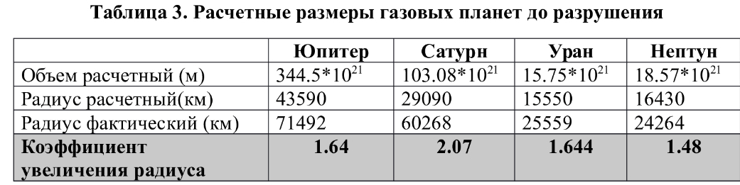 =3V/4π (стр.2 табл.3). Коэффициент увеличения (стр.4 табл.3) рассчитывается как отношение фактического радиуса планеты к расчетному.