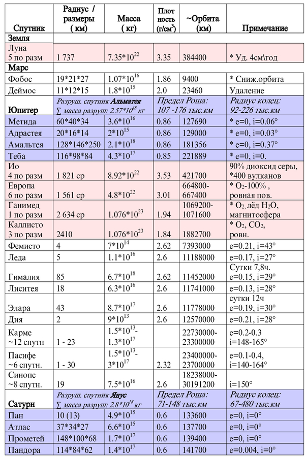 Чтобы понять причину разрушения планет, была сформирована таблица 4 спутников, которая оказалась довольно сложной. Данные для таблицы (приблизительные) были взяты из интернет энциклопедии Википедия. Она постоянно меняется, поэтому значения в таблице 4 могут не соответствовать последним изменениям. В этой таблице не анализируются удаленные спутники газовых планет, поэтому они объединены в группы по принципу близости и схожести орбит. Каждой группе дано название самого крупного в ней спутника. Синим цветом выделены разрушенные спутники, розовым цветом – луны, сферические спутники планетарного типа.