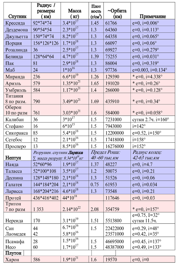 Уран: Титания, Оберон, Ариэль, Умбриэль, Миранда.