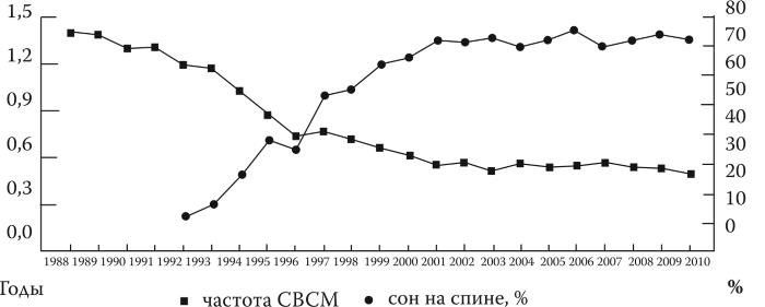 В 1994 году в США началась кампания Back to sleep – родителям стали давать рекомендацию класть младенцев спать на спинку, и уже к 1999 году число случаев SIDS сократилось почти в два раза (см. график).