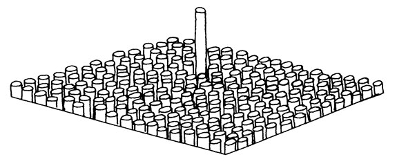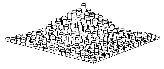Возьмем популяцию вида, в которой между конкретными индивидами уже при рождении существует заметная разница в устройстве интеллекта. Например, предположим, что некоторые из них владеют умением исполнять Ловкий Трюк, который позволяет спастись от опасности или существенно увеличивает шансы на выживание. Обычно такие различия в уровне приспособленности отдельных особей популяции демонстрируют с помощью «адаптивного ландшафта» или «ландшафта отбора»102. Уровень приспособленности на такой диаграмме отмечается по оси Y (чем выше, тем лучше), а оси X и Z зарезервированы за факторами, влияющими на воплощение конкретного замысла (в данном случае – особенностями развития мозга). Каждая из возможных особенностей развития изображается столбиком на диаграмме: каждый столбик – особый генотип, а их совокупность представляет собой ландшафт. Очевидно, что лишь одна из комбинаций будет выигрышной (то есть лучше любого заурядного варианта): ее столбик возвышается на диаграмме, словно телефонный столб посреди пустыни.