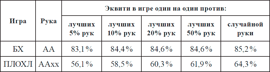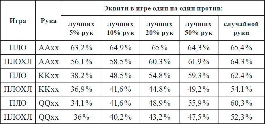 – Как можно видеть из таблицы 2.2, крупные пары в этой игре теряют почти всю свою силу. В основном это объясняется тем, что такие руки, как правило, не содержат двух хороших низких карт, с которыми можно было бы составить выигрышное лоу, а также тем, что одинокая пара в большинстве случаев не составляет на флопе сет (шансы такой руки выиграть раздачу без усиления стремятся к нулю).